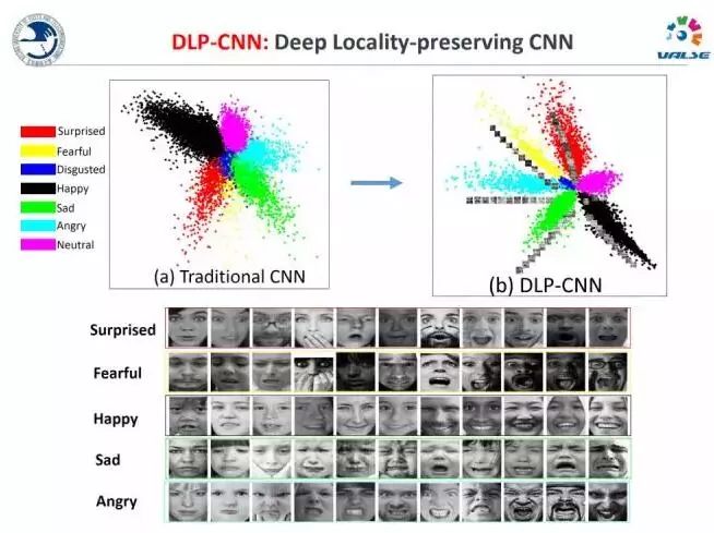 同时对应的可视化结果表明,DLP-CNN所学到的特征与传统的仅用softmax损失所学到的特征相比,类内间的分布更加紧促更加有利于分类。同时在特征空间的流型分布上,每一类表情都是具有连续的强度变化趋势的。