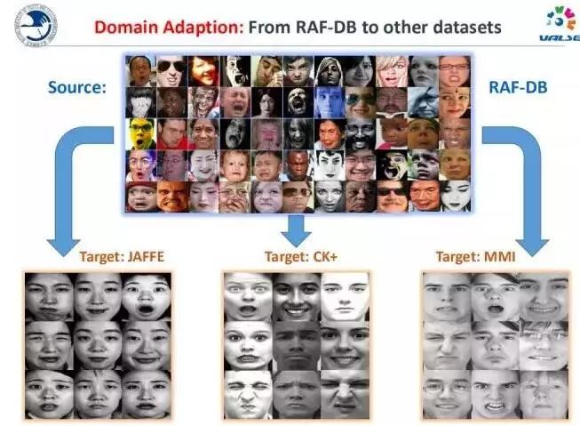于是我们将RAF-DB作为源域,在CK+,JAFFE,MMI等目标域上进行了domain adaption算法的评估。实验结果显示,该区域自适应方法能够有效地提高跨库人脸表情识别率。
