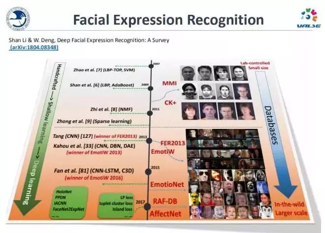 最近的一篇关于深度表情识别的综述(http://arxiv.org/abs/1804.08348)发现,整个人脸表情识别的研究是跟随人脸识别的发展而发展的,人脸识别领域比较好的方法会同样适用于表情识别。该综述从算法和数据库两方面调研了人脸表情识别领域的进展。