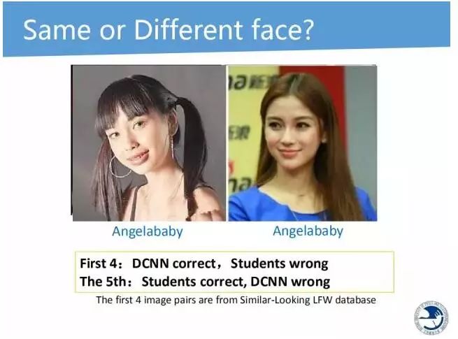 这个男人呢?真不是。这个呢?这个是。这两张是尼克基德曼吗?前四道(来源于SLLFW数据库的)题目,机器都做对了,而大部分同学都错误了。这个Angelababy呢?同学们都做对了,而机器缺失误了,说明现在深度学习在先验知识的利用和“熟人”识别能力方面跟人类还是有差距。