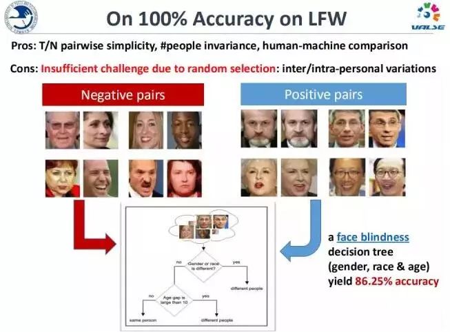 利用LFW数据的规律,我们做了一个“脸盲”的决策树:它简单地把不同的性别和人种,或者年龄差别大于10岁的情况,都认为是不同人。这么简单的决策树,准确率竟然能够达到了86%。充分说明LFW的实验对身份验证的评测难度确实不足。