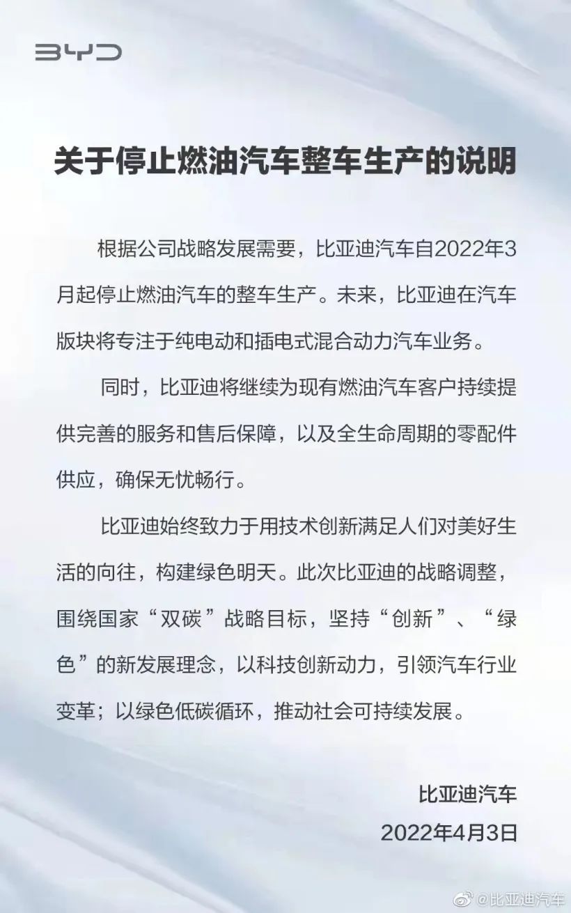 【比亚迪宣布停止燃油汽车整车生产】4月3日,比亚迪汽车正式宣布,根据其战略发展需要,自2022年3月起停止燃油汽车的整车生产。比亚迪表示,“未来,比亚迪在汽车版块将专注于纯电动和插电式混合动力汽车业务。这标志着,比亚迪成为全球首个正式宣布停产燃油汽车的车企。”比亚迪3月份共销售10.49万辆汽车,同比增长422.97%,均为新能源汽车,没有生产和销售燃油汽车。(澎湃新闻)