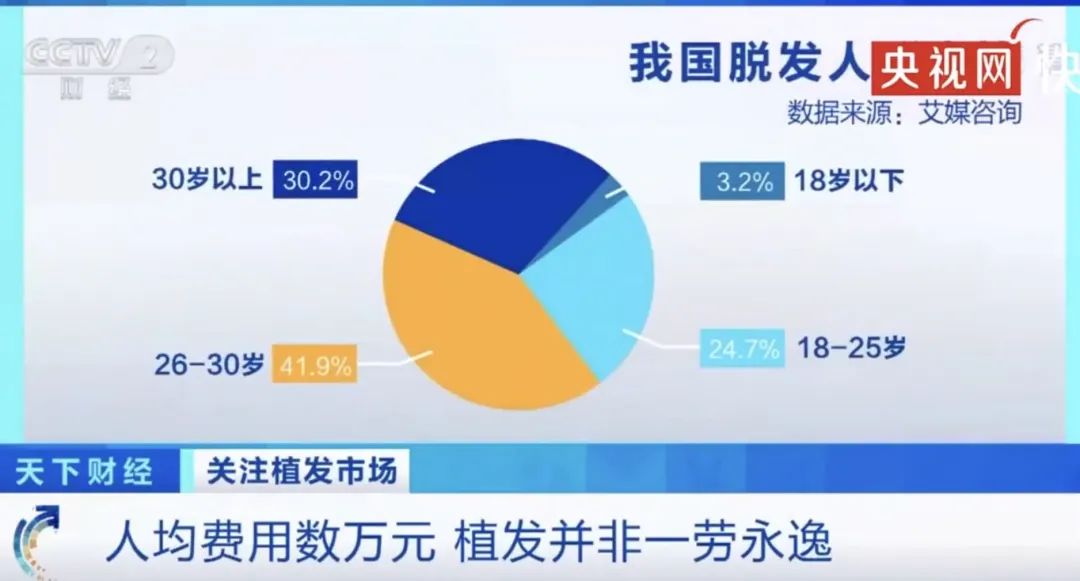 【全国脱发人群30岁以下占比近七成】数据显示,我国有超过2.5亿人正饱受脱发的困扰,平均每6人中就有1人脱发,大批90后也被脱发所困扰。我国脱发群体中,30岁以下占到总数的69.8%,其中占比最大的为26到30岁的青年,高达41.9%。(央视财经)