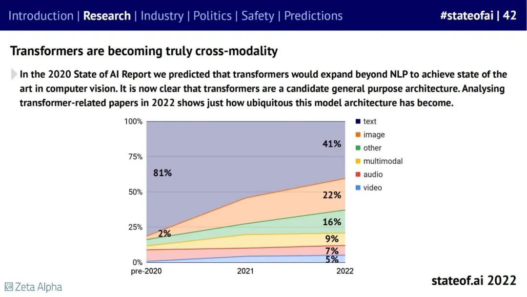 与此同时,扩散模型在图像的生成上正在超越GANS,成为文本生成图像最先进的模型。在文本转视频、文本转音频,以及分子设计等领域也开始得到应用。