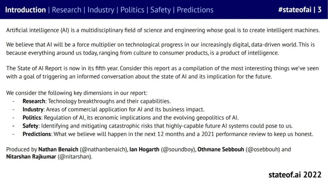 作为每年发布的AI报告,作者从研究、产业、政策、安全、预测五个维度对最新人工智能发展现状和未来预期进行了深入分析和说明。