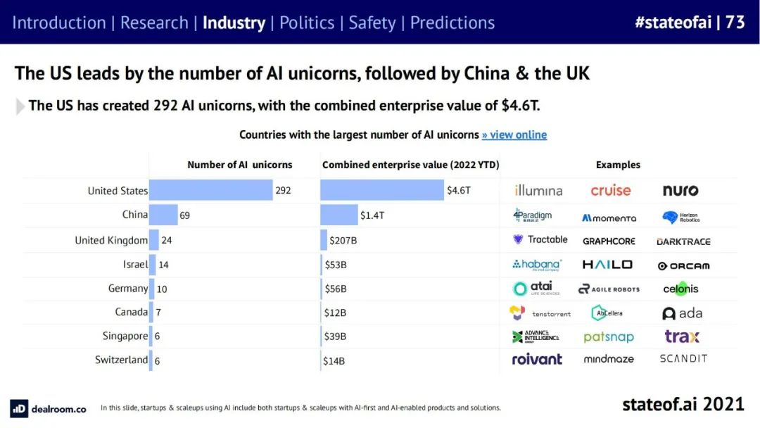国家间的横向对比上,美国的人工智能独角兽数量领先,其次是中国和英国。截至目前,美国有292家人工智能独角兽企业,价值合计达4.6万亿美元。中国有69家,总估值1.4万亿。