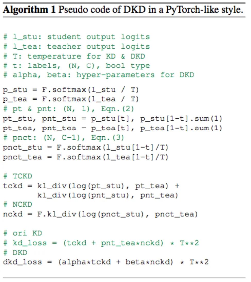 和 KD Loss 相比, 该研究将限制 NCKD 的权重 替换为了 , 并给 TCKD 设置了一个权重 。DKD 可以很好地解决刚才提到的两个问题:一方面, TCKD 和 NCKD 被解耦, 它们各自的重 要性可以独立调节; 另一方面, 对于蒸馏更重要的 NCKD 也不会再被 Teacher 产生的高置信度抑 制, 大大提高了蒸馏的灵活性和有效性。DKD 的伪代码如下: