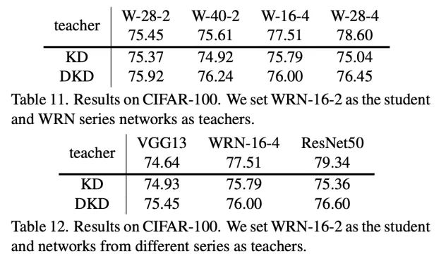 为了证明该观点,研究者也进行了一系列的对比实验。如表 11 和表 12 所示,当使用 DKD 时,大模型蒸馏效果变差的问题被显著改善。该研究希望这一点可以为后续的工作提供一些 insight。