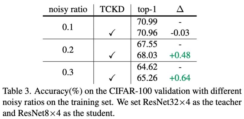 表 3 中,该研究通过控制 noisy ratio 对数据集的标签引入不同程度噪声,ratio 越大表示噪声越大。可以看到,随着数据集的噪声变大,单独使用 NCKD 的效果变得越来越差,同时引入 TCKD 的增益也越来越大。说明在越难学的数据上,TCKD 的作用就会越明显。
