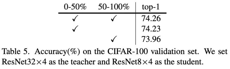 实验结果如表 5 所示,0-50% 表示置信批次,50-100% 表示非置信批次。第一行是在整个训练集上做 NCKD 的结果,第二行表示只对置信批次做 NCKD,第三行表示只对非置信批次做 NCKD。显然,置信批次上使用 NCKD 带来了更主要的涨点,说明置信度更高的样本对蒸馏的训练过程是更有益的,因此是不应该被抑制的。