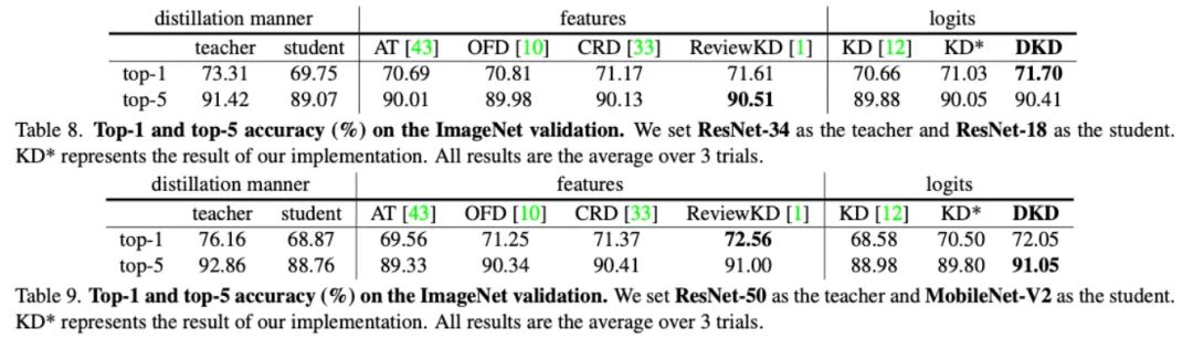 表 6~9 中提供了 DKD 在 CIFAR-100 和 ImageNet-1K 两个分类数据集上的蒸馏效果。和 KD 相比,DKD 在所有数据集和网络结构上都有明显的性能提升。此外,与过去最好的特征蒸馏方法(ReviewKD)相比,DKD 也取得了接近甚至更好的结果。DKD 成功使得 logits 蒸馏方法重新回到了 SOTA 的阵营中。