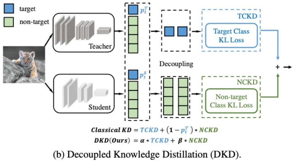 可以观察到, 式中的第一项 只牵涉到了目标类别 vs 非目标类别的二分类概率分布 研究将第一项命名为目标类别知识蒸馏 Target Class Knowledge Distillation (下文简称 TCKD), 将第二项中的 KL 散度命名为非目标类别知识蒸馏 Non-target Class Knowledge Distillation(下文简称 NCKD)。至此, 该研究完成了对 KD Loss 的拆分, 将其分成了两个可单独 使用的部分, 并可以分析其各自的作用: