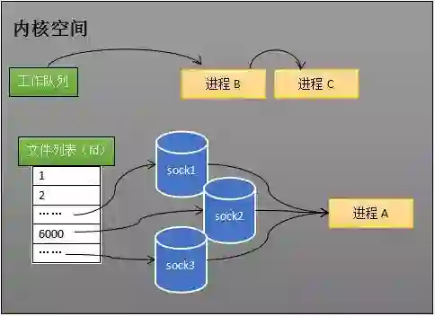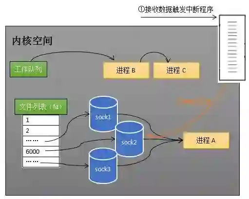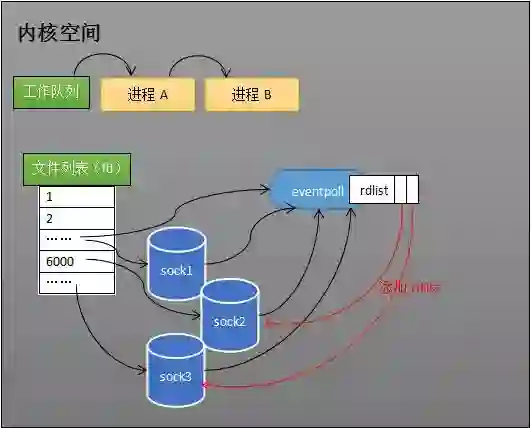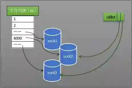 如上图所示,计算机共有三个 Socket,收到数据的 Sock2 和 Sock3 被就绪列表 Rdlist 所引用。