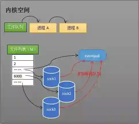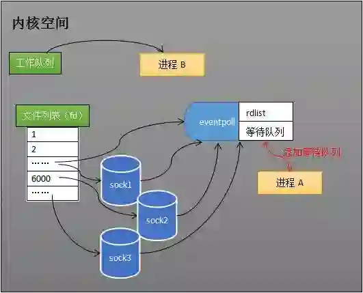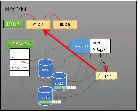 如上图所示,内核会将进程 A 放入 eventpoll 的等待队列中,阻塞进程。