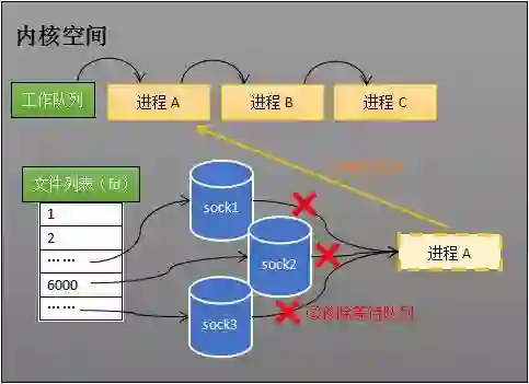 当程序执行到 Recv 时,操作系统会将进程 A 从工作队列移动到该 Socket 的等待队列中(如下图)。