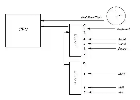 下图展示了各种硬件通过中断与 CPU 交互的过程:
