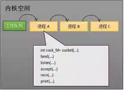 下图的计算机中运行着 A、B 与 C 三个进程,其中进程 A 执行着上述基础网络程序,一开始,这 3 个进程都被操作系统的工作队列所引用,处于运行状态,会分时执行。