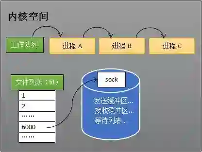 这个 Socket 对象包含了发送缓冲区、接收缓冲区与等待队列等成员。等待队列是个非常重要的结构,它指向所有需要等待该 Socket 事件的进程。