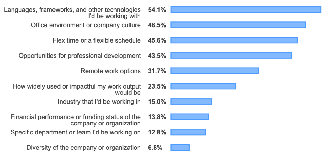 让受访者去权重工作中重要的因素时,有54.1%的人认为自己使用的语言,框架和技术很重要。
