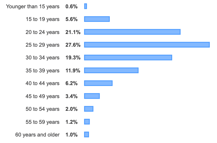 2019年,Stack Overflow对全球近90,000名开发人员进行了调查(本次调查对象不包括中国),调查显示,国外20-34岁程序员人数占比最大,35岁以上的程序员占总数的25.7%。2018年占24.7%,相比之下,35岁的程序员人数在增加。