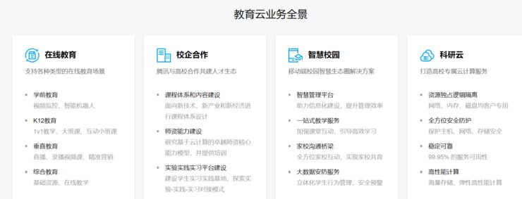 3)智慧校园:是面向各级各类学校及教育主管部门推出的移动端校园智慧生态圈解决方案,整合腾讯云计算、大数据、人工智能等核心能力,连接教育领域优质生态合作伙伴提供的垂直服务,为学校提供全场景的智能化服务,全面覆盖智慧管理、智慧教学、智慧安防、智慧家校、智慧办公、智慧媒宣等六大领域。