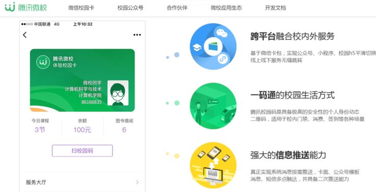 5)腾讯微校:是以微信校园卡和腾讯校园码为核心的数字校园整体解决方案。依托微信庞大的用户基础和连接一切的能力,连接校园的人、服务和生态,提升校园管理现代化水平。线下建立以物联网为基础的数字化的校园工作、学习和生活一体化环境,线上以各种应用服务系统为载体,将教学、科研、管理和校园生活进行充分连接。微校运用腾讯的云、大数据、物联网、AI 等能力,打造包括共享数据中心的中台服务,为学校的决策提供数据助力。