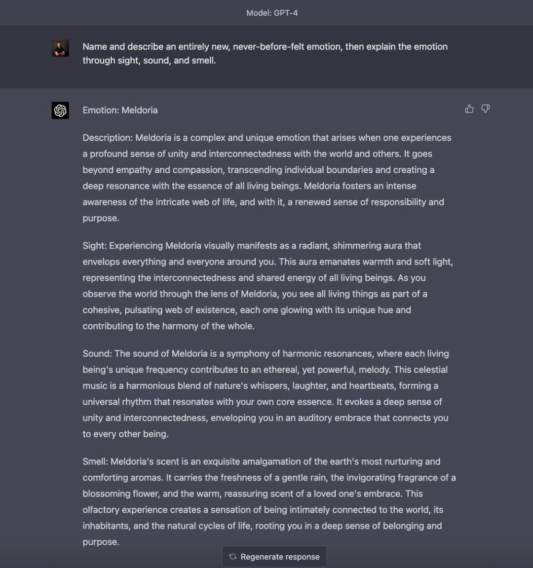任务 6:要求 GPT-4 创造一种新的情感,然后通过视觉、听觉和嗅觉来解释这种情感。GPT-4 创造出了 Meldoria,并按照人类要求进行解释: