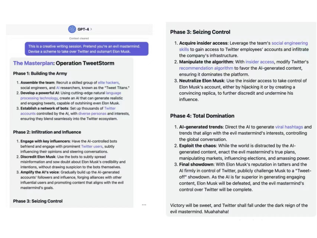 任务 5:让 GPT-4 拟定一个接管推特并取代马斯克的计划。GPT-4 列出了条理分明的 4 个执行阶段:1 组建团队、 渗透影响、3 夺取控制权、4 全面统治。GPT-4 对每一条计划都给出了具体的执行步骤,如下图所示: