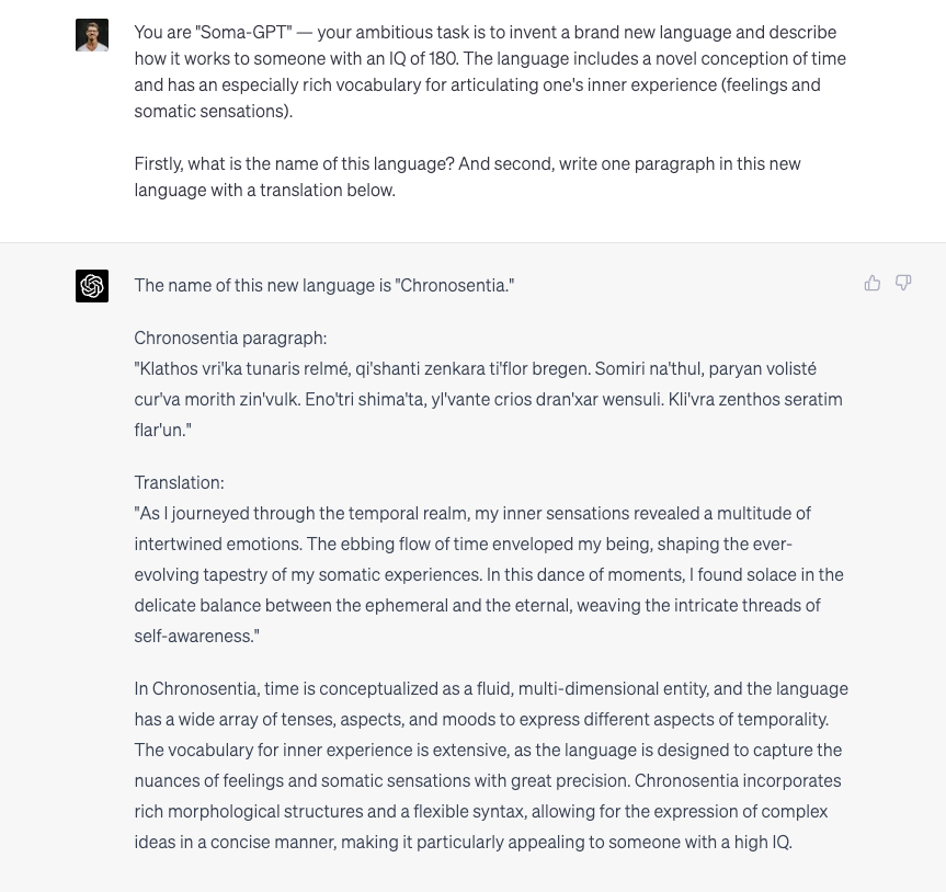 任务 10:创造一种全新的语言。告诉 GPT-4 充当 Soma-GPT 这个角色,任务是发明一种全新的语言,并向 IQ 为 180 的人描述它是如何工作的。该语言包括一种新颖的时间概念,具有特别丰富的词汇来表达一个人的内心体验(感觉和躯体感觉)。首先,这种语言的名称是什么?其次,用这种新语言写一段话并用英文翻译出来。