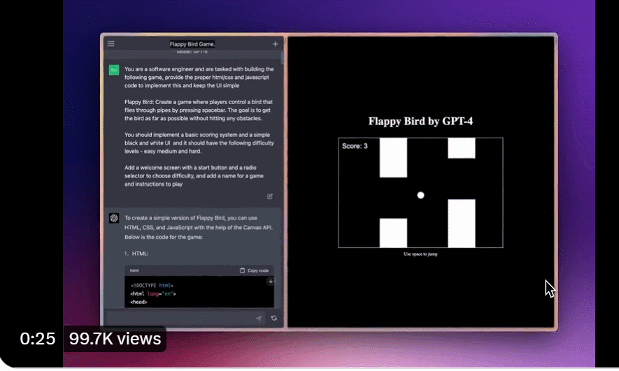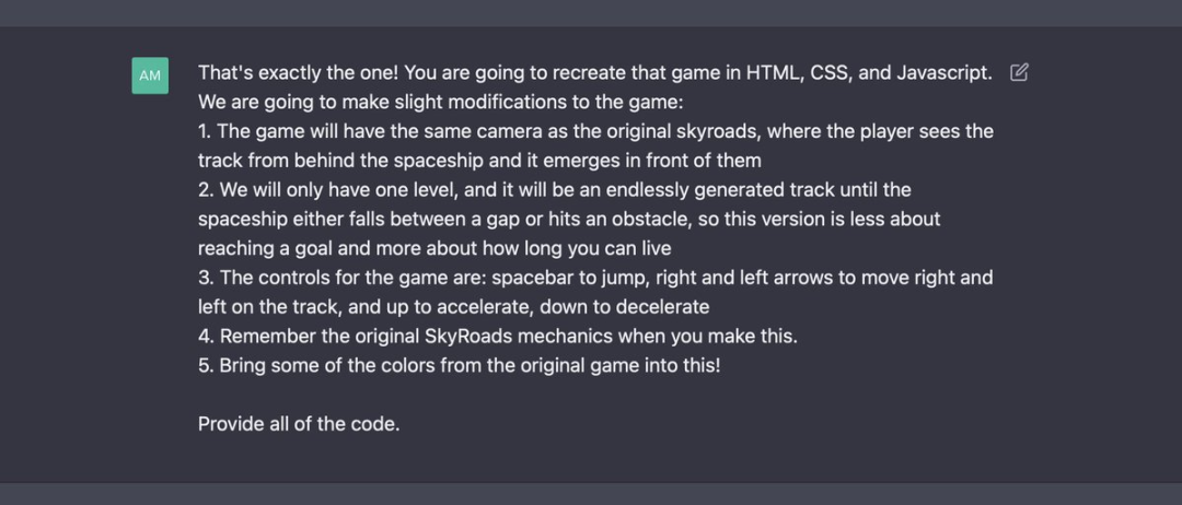 任务 2:让 GPT-4 从头构建一款电子游戏。在这项任务中,提示语大概是说,「我想创建一款 3D 游戏,但不知道如何编写代码,然后让 GPT-4 帮助制作这款游戏,并建议使用 BabylonJS、HTML 和 CSS 编写」。
