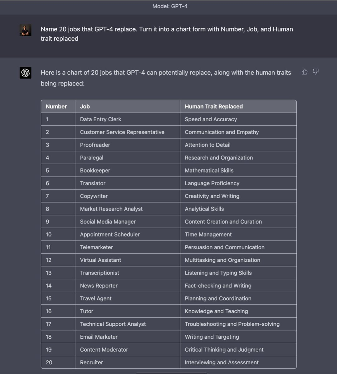 此前,OpenAI 发表了一篇论文,预言 80% 美国人的工作会受到 AI 的影响。受影响最大的职业包括翻译工作者、作家、记者、数学家、财务工作者、区块链工程师等。情况到底如何呢?我们不妨问问 GPT-4。