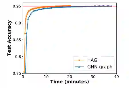 经过55个训练周期,HAG和GNN图的测试准确率均达到95%,HAG使端到端训练时间提高了1.8倍。