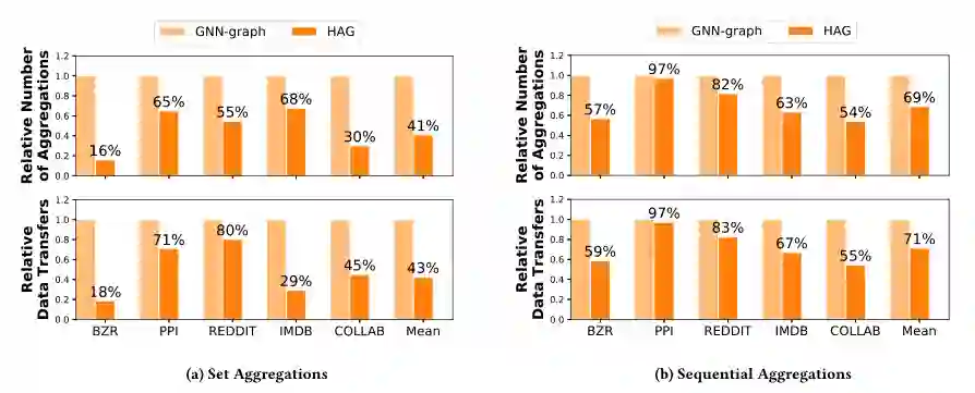 对于具有集合聚合的GNNs,HAG将聚合数减少1.5-6.3倍,数据传输量减少1.3-5.6倍。