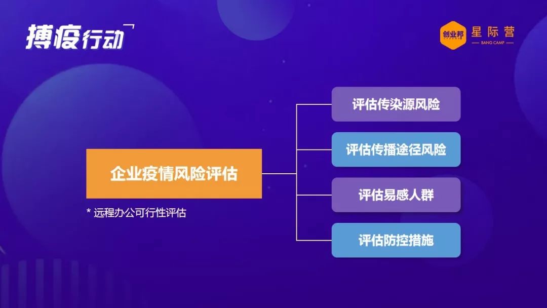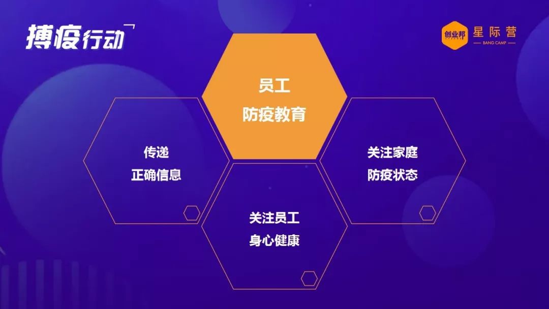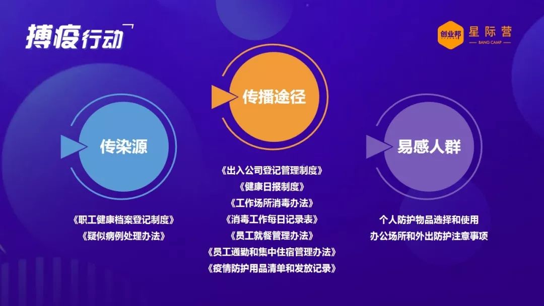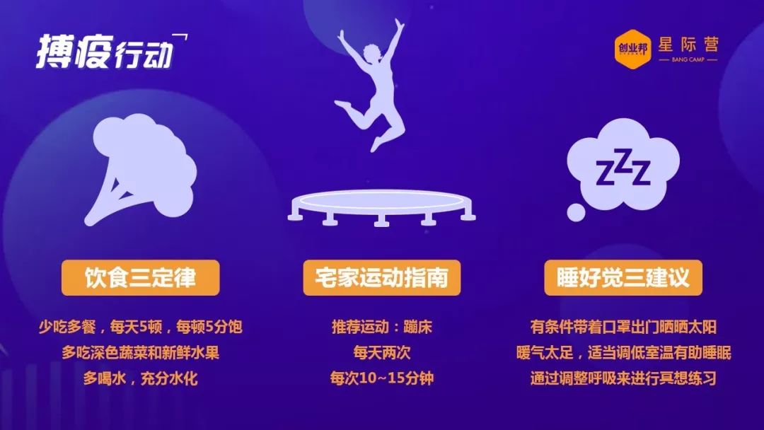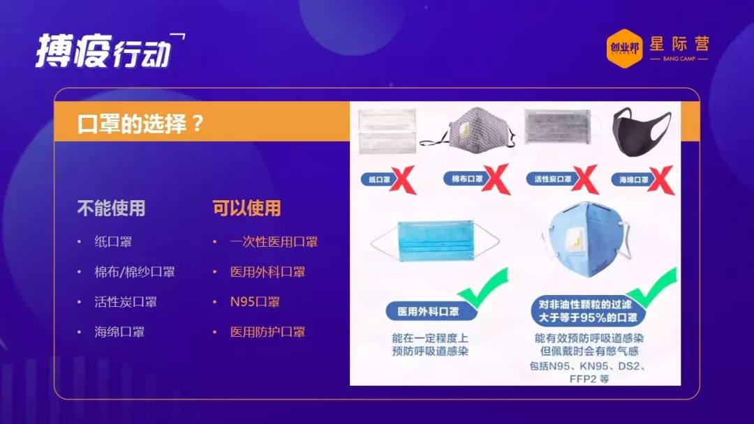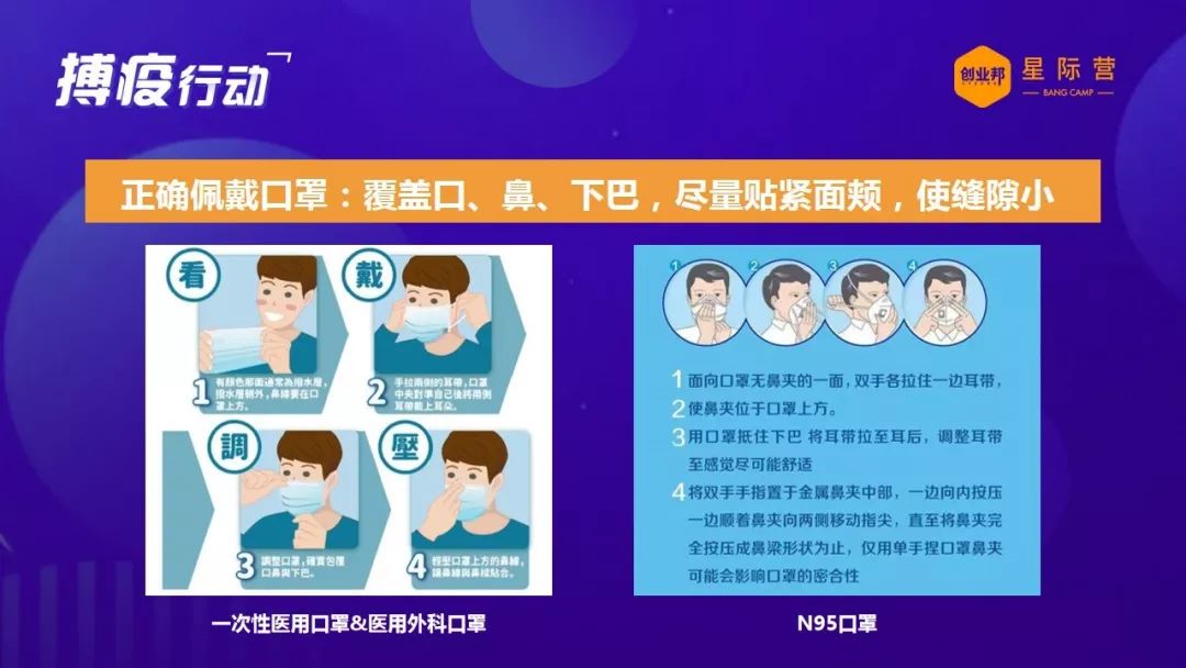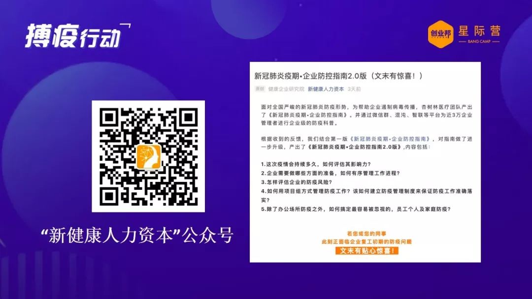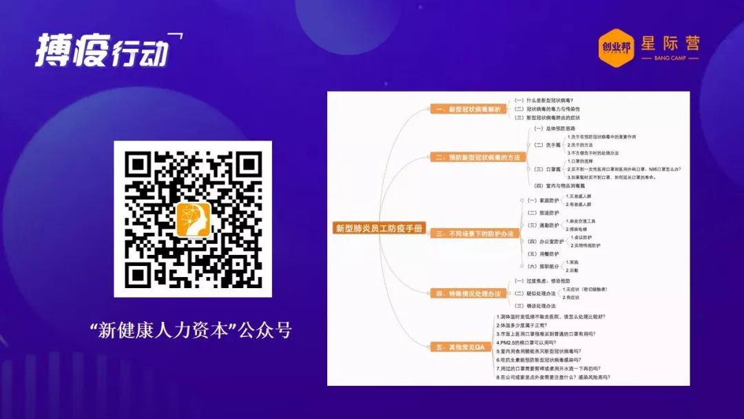 大家尽可能的在这几个月里面能够忍一忍,所以为什么提倡大家要居家办公,其实也是把风险降低到最低。这个地方我们有给员工给我们个人也有一个防疫的指南,大家还可以联系创业邦同事去免费的领取指南,可以获得我们的指南的推荐。