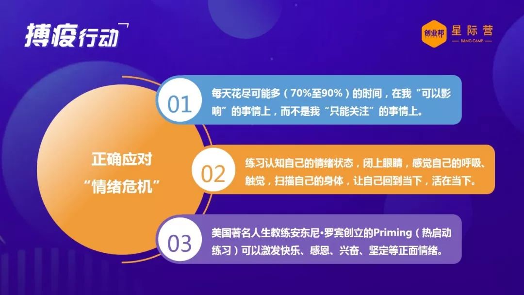 像咱们创业邦的很多小伙伴都是中小企业主,咱们面临着很大的危机。所以很多人大家心情都特别的焦躁而抑郁,虽然这个病没得到自己身上,但是自己都像得了一场病一样,这个其实是一个很大的问题,很多人说中国人这一次虽然有很多人没有得肺炎,但是大家的心理都像病了一场,我们怎么样让自己的心理调节过来,我给大家讲三个方法。