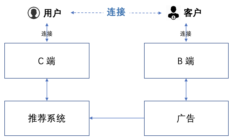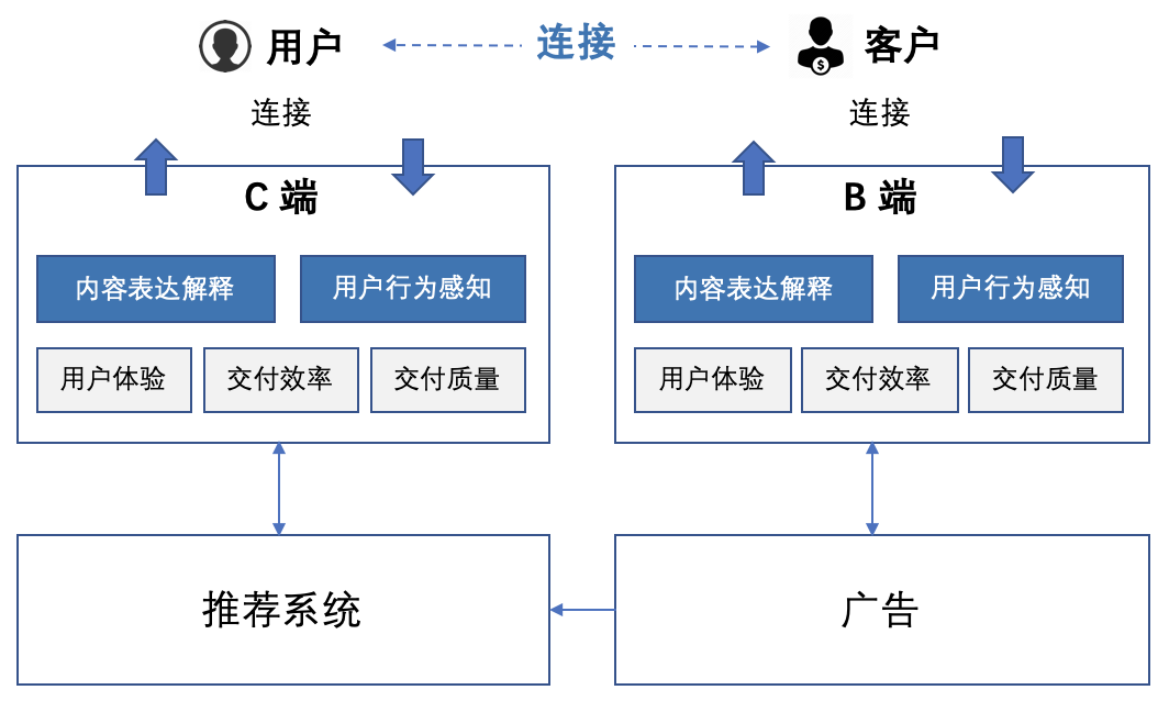 陈敏亮: 流量变现本质是用户与客户的连接,从大前端视角又可以拆分为用户与流量 C 端的连接以及客户与支撑平台 B 端的连接,最终构成用户与客户间的连接。