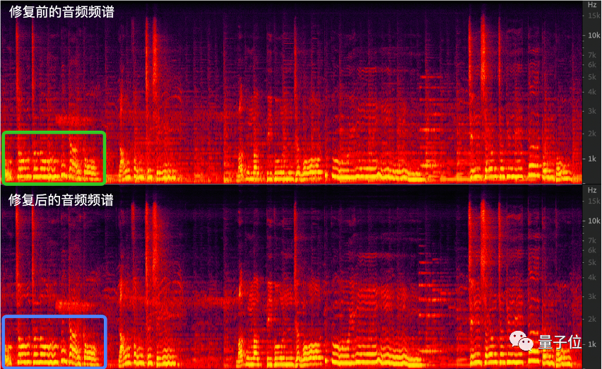 这一点在频谱图上也表现得很明显:降噪前,音频频谱较为浑浊;降噪后,频谱图清晰了不少。