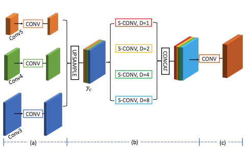 图 2:本文方法的框架概览。该方法采用了原版 FCN 作为主干网络。在主干之后,研究人员提出了新型上采样模块 JPU,该采样模块将最后三个特征图作为输入并生成了高分辨率特征图。然后使用多尺度/全局上下文模块来生成最终标签图。