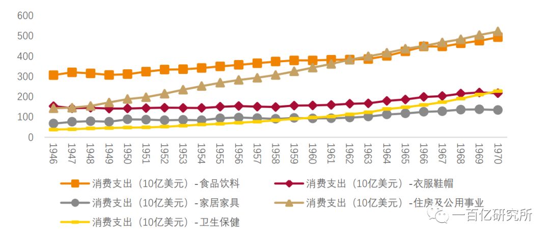 1946-1970 年,在上述消费人口基数扩大、居民消费水平普遍提升两个因素驱动下,加之战后人们对于美好生活的强烈向往,美国经历了较长一段时间的大众消费繁荣,个人消费支出总量复合增速 3.8%(剔除通胀影响)。