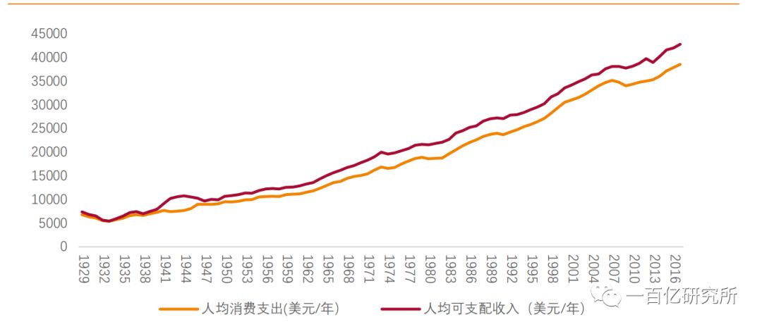 当然,2019年中美贸易战的杀出,尤其是出口贸易额会受到重大影响。但在这个大环境下,城镇、农村居民可支配收入稳步提升,政府对消费支持力度加大的背景下,未来我国消费将走出怎样的成长路径,消费结构又将如何变迁?对比着美国消费成长路径及消费结构变迁规律,以期对我国消费未来发展方向有所指引。