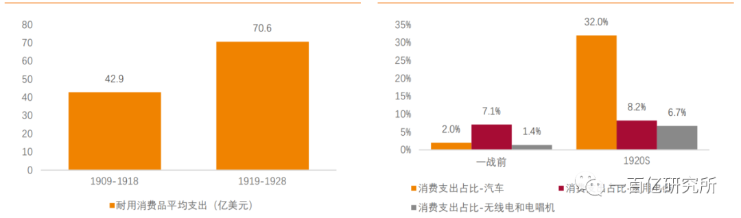 工业经济发展使得可供消费商品种类、数量提升,“收入上涨”+“消费信贷”驱动购买力上升,“能买到”+“有能力买”共同催动耐用消费品消费热潮,汽车、无线电、家用电器等耐用品消费量大涨。