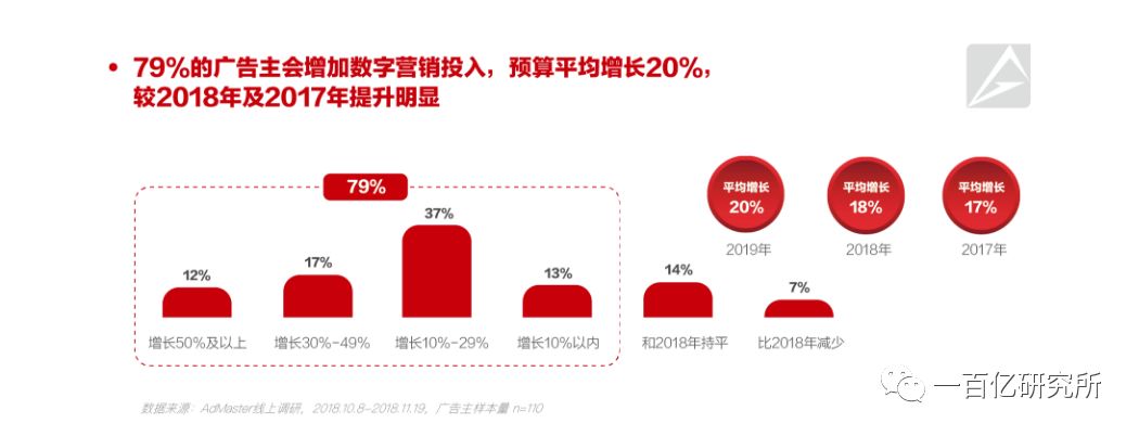 尽管2019年是中国经济发展困难的一年,但相反,AdMaster数据显示,有79%的广告主表示将增加来年的数字营销预算,其中,预算增长30%以上的广告主占比近三成,整体预算平均增长20%。