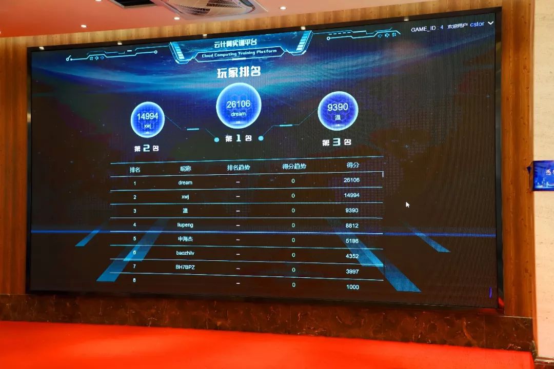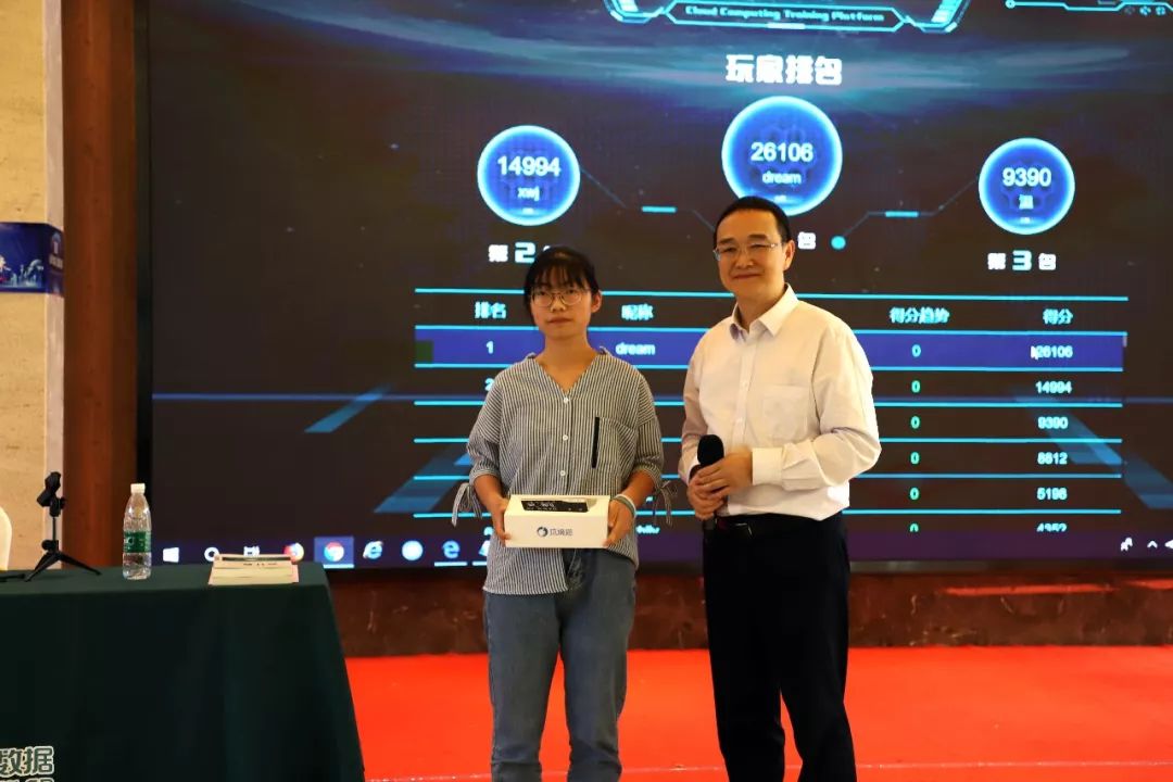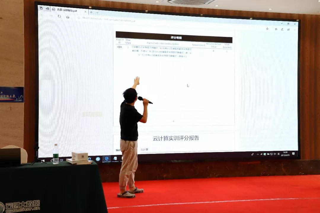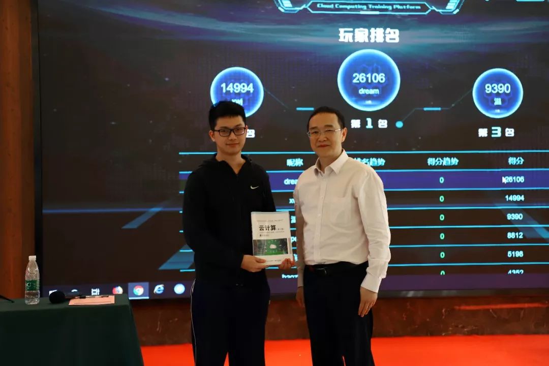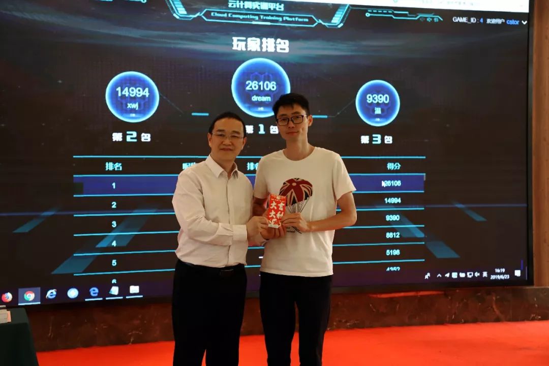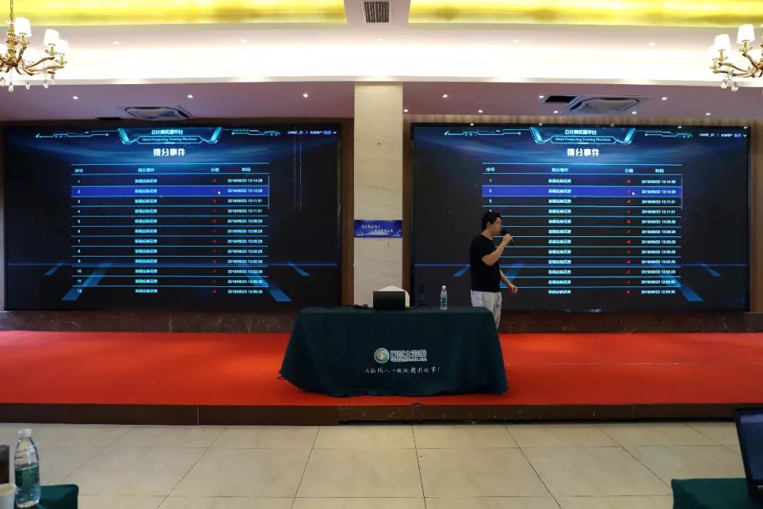 最后,在两个多小时的比赛以后,比赛排名一槌定音,平台自动评分决出了前三甲,由谢超工程师对评分明细进行了逐项解说,并由刘鹏教授亲自为其颁发奖品与奖金。同时,获奖选手也分享了其比赛心得(包括环境部署以及出现问题过程的应对办法等),表示此次培训受益匪浅,不仅真正学到了实战技能,同时也感受到了犹如世界技能大赛一般惊心动魄的比赛氛围。