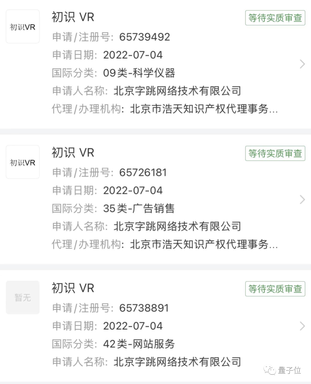 天眼查App显示,近日,北京字跳网络技术有限公司申请注册3枚“初识VR”商标,国际分类包括广告销售、科学仪器、网站服务。