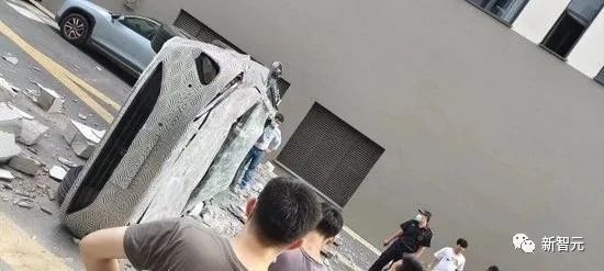 车头落地后朝外,通过这个方向大致可以确定冲破墙体时车辆的方向。也就是说,这台车在冲出大楼之前,是车尾朝外的状态。