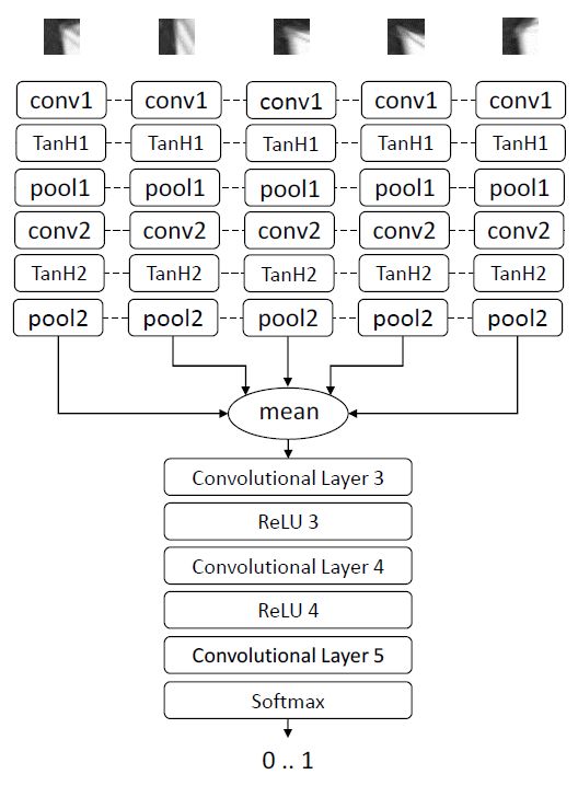 图1 本文所提出的的网络架构有5个分支,输入为5个图像块,输出为用于选择正确深度值的相似度得分。