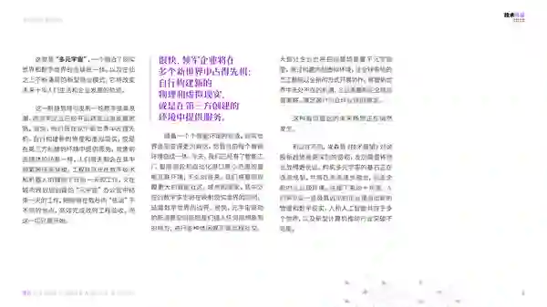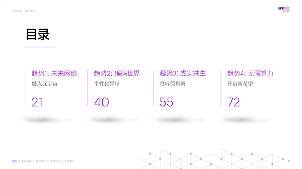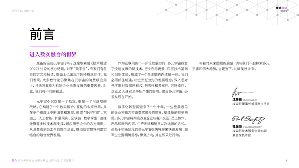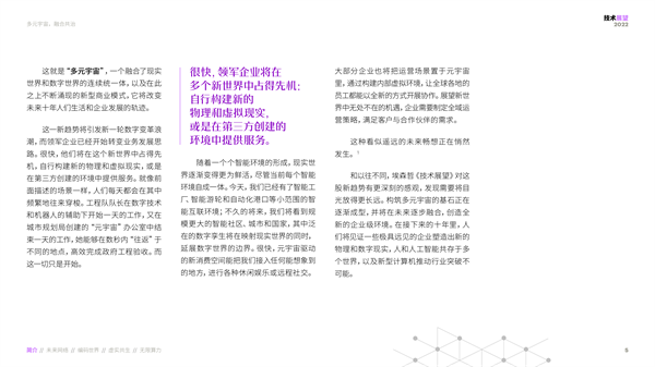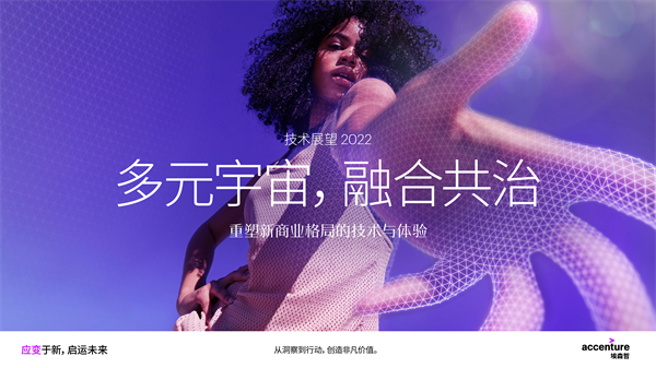 埃森哲连续第22年发布《技术展望》报告,预测了将引发新一轮数字变革浪潮的新趋势。报告认为,元宇宙不仅仅是一个概念,更是一个可落地的战略。它由云、人工智能、扩展现实、区块链、数字孪生、边缘计算等多种技术群支撑,可应用于企业的方方面面,从消费者到员工再到整个企业运营,推动现实世界向虚实结合的融合世界发展。