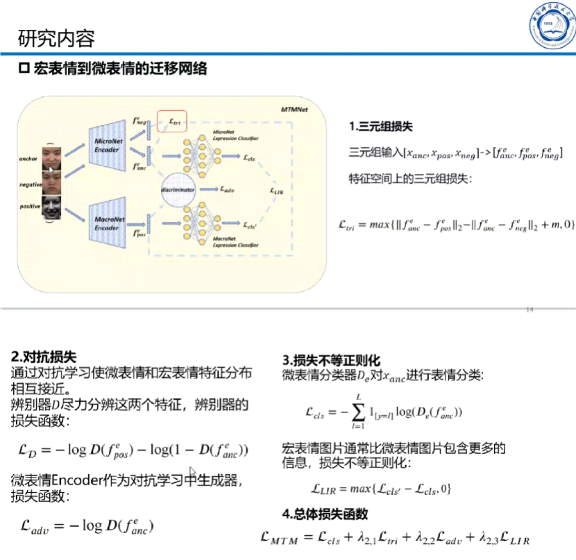 然后夏斌同学介绍了他们的方法框架,如下图所示。首先,为微表情设计了一个表情身份解缠网络(如图左上部分)。将微表情的表情图像和无表情图像输入到解缠网络,分离得到微表情样本的表情信息和身份信息,并将表情信息用于后续的分析。同理,为宏表情样本设计了一个表情身份解缠网络(如图左下部分)。然后,搭建从宏表情到微表情的迁移网络(如图右半部分),利用三元组分类(微表情图片(固定样本),同一组别的宏表情样本(正样本),不同类别的微表情图片(负样本)),通过解缠网络的编码器提取表情信息,在特征空间和标签空间中,将宏表情的信息迁移到微表情,实现微表情识别。