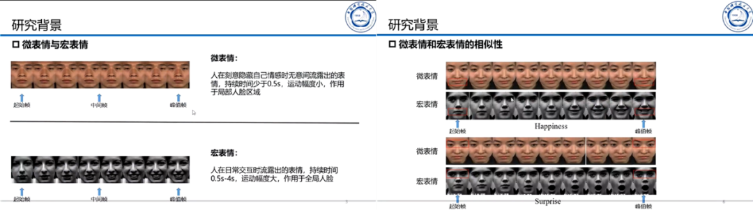 潘航首先通过宏表情和微表情的对比介绍了微表情的特点和相关应用,并对面部宏表情和微表情在视频中的检测任务和相关数据库(中国科学院心理研究所发布的