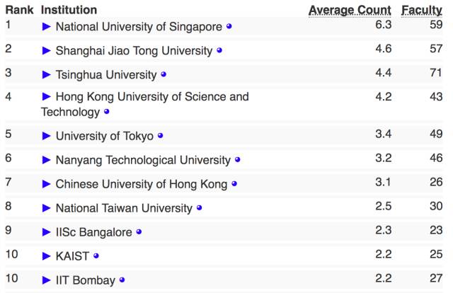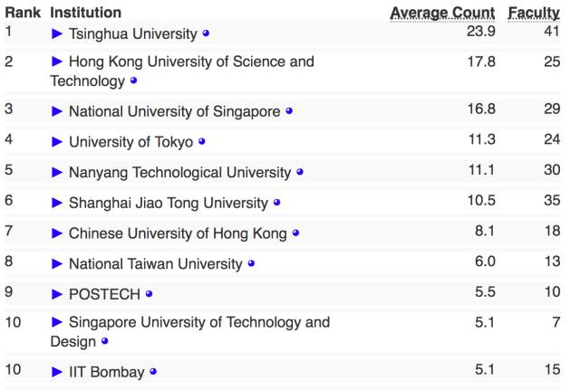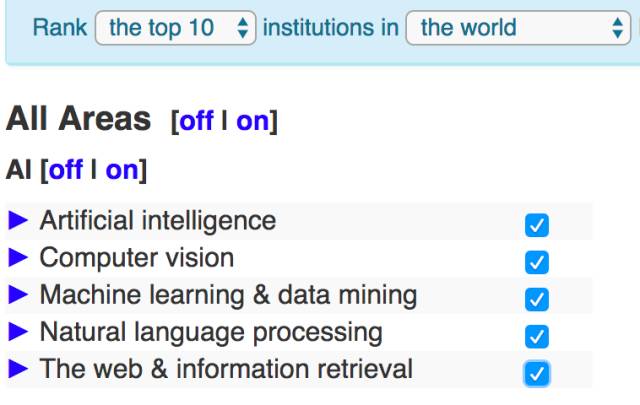 在这部分,我勾选了全球、top 10、仅人工智能,查看各院校人工智能实力排名,结果如下: